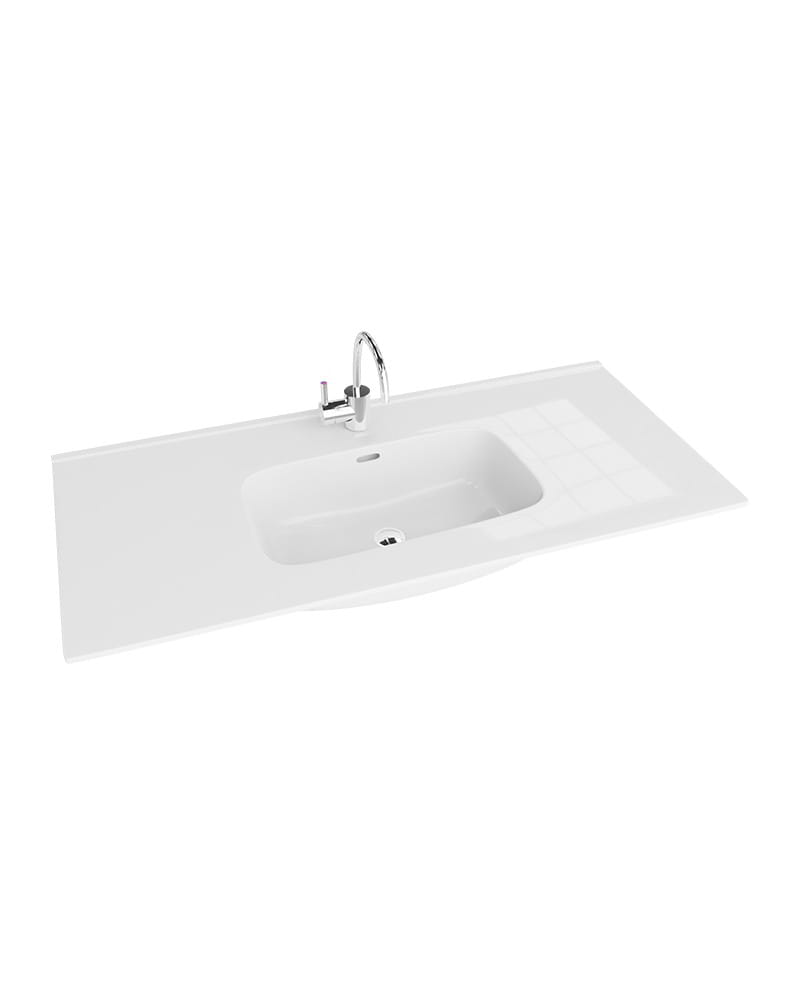 Umywalka MINNESOTA 120 cm Lavita, dostępna w ofercie firmy ATUT, charakteryzuje się prostokątną formą z dużą, dodatkową powierzchnią w krawędziowym obszarze bryły.